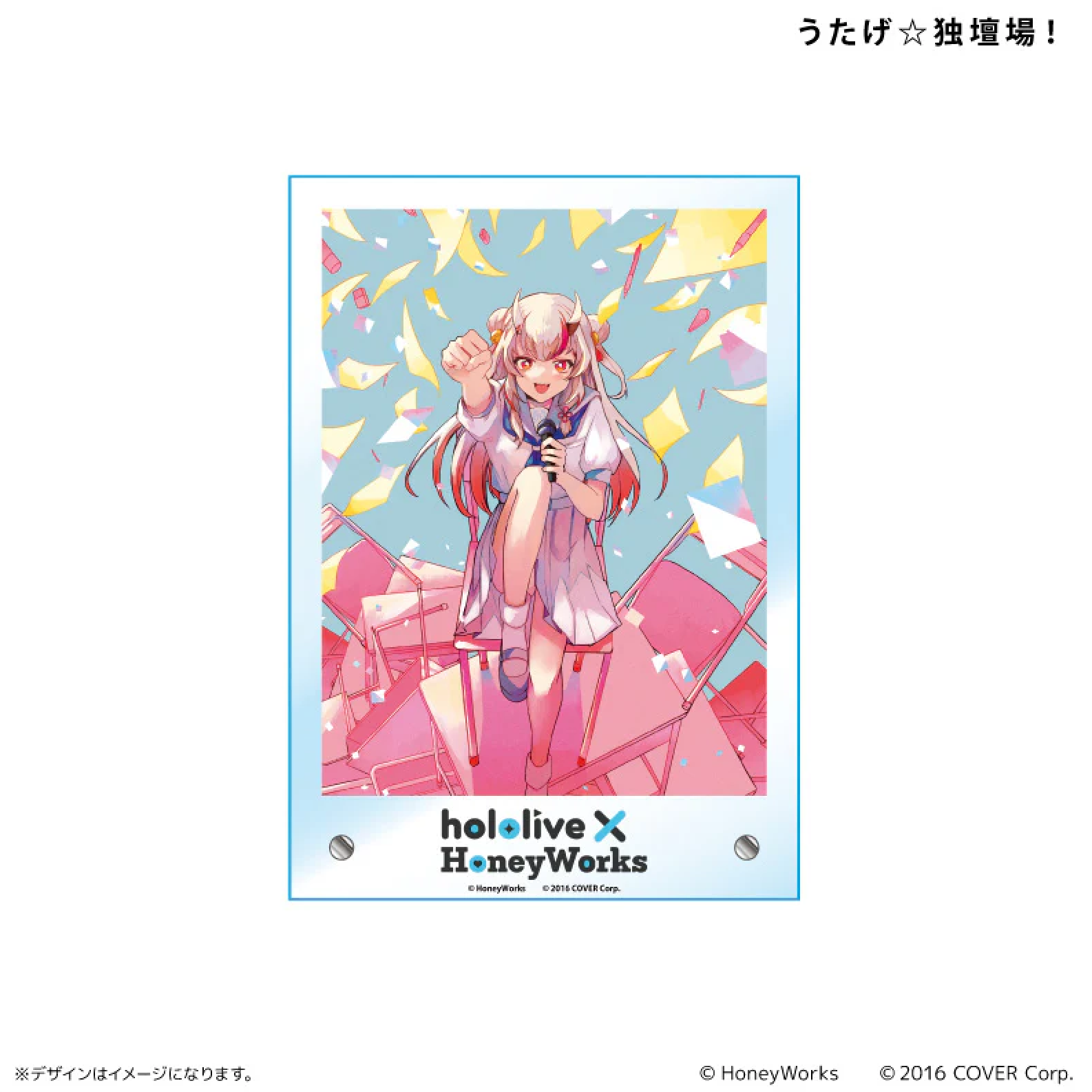 壓克力板印有「hololive x HoneyWorks」合作作品「Utage☆Dokudanba!」的概念圖。它採用相框式設計,方便您在房間裡展示自己喜歡的插畫。